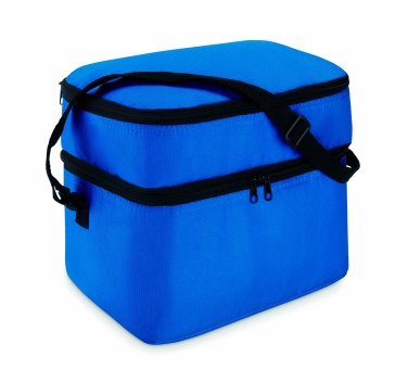 Сумка-кулер с двумя фольгированными изнутри отделениями и регулируемым наплечным ремнем.