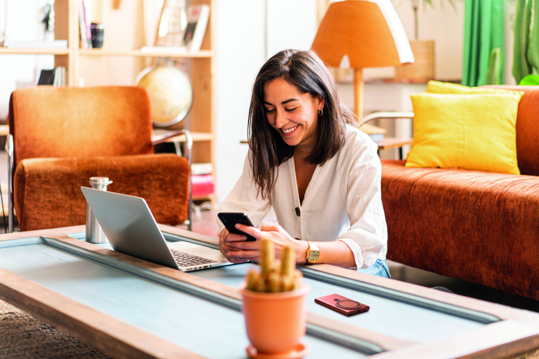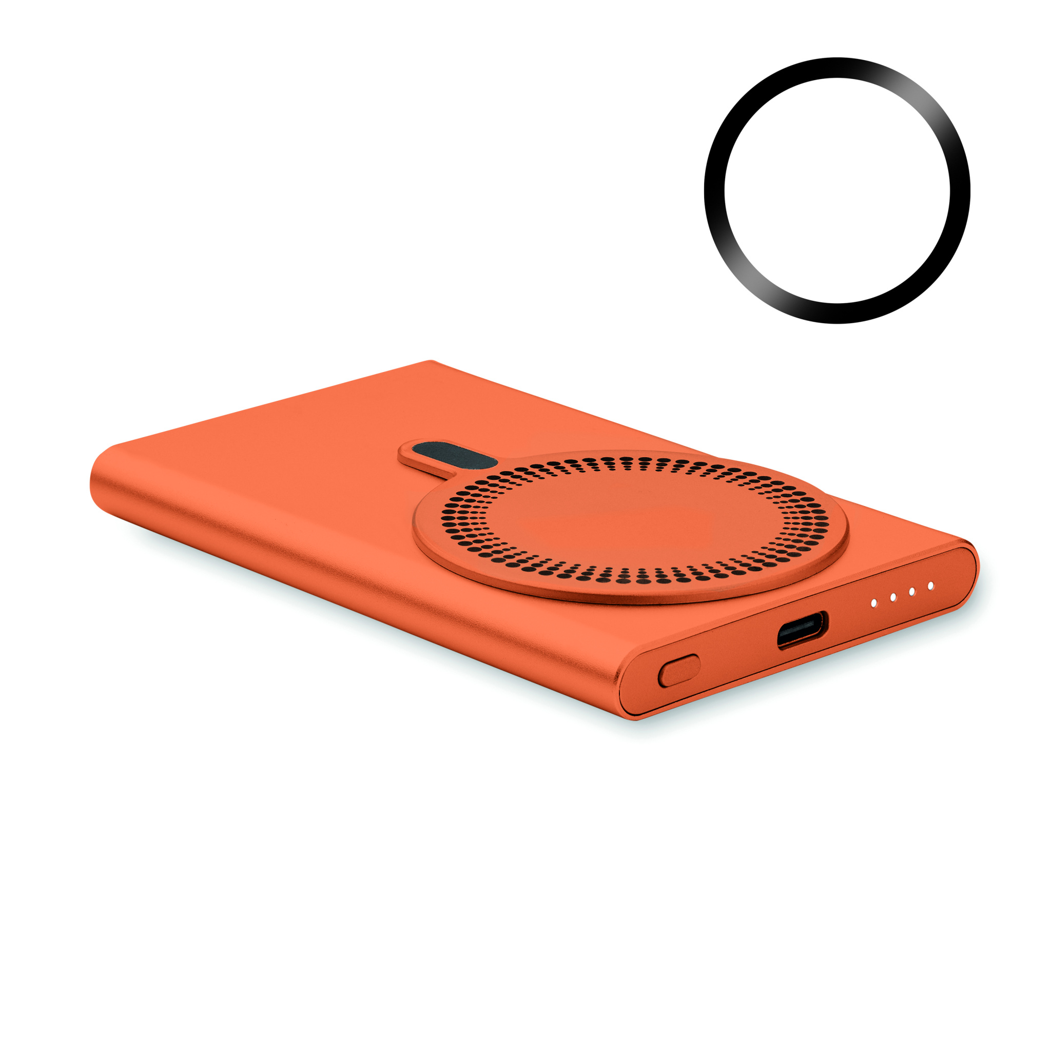 Magnetic wireless charger (15W) in recycled aluminium and power bank (5000 mAh). Output: DC 9V/1.66A. Supports quick charging technology (20W). In/Output: Type-C. Power delivery (PD) support to charge the newest laptop MacPro®. In/Output: Type-C.