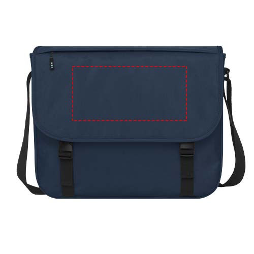 Hållbar GRS-certifierad RPET-laptopväska gjord av 60 % återvunnet material. Utrustad med ett stort huvudfack med blixtlås, en vadderad ficka för 15 tums bärbar dator och ett främre fack (båda med kardborrestängning). Levereras med täckande omslag med ficka med dragkedje- och spännesstängning. Har bekvämt vadderat och justerbart axelband och bagagebälte på baksidan.