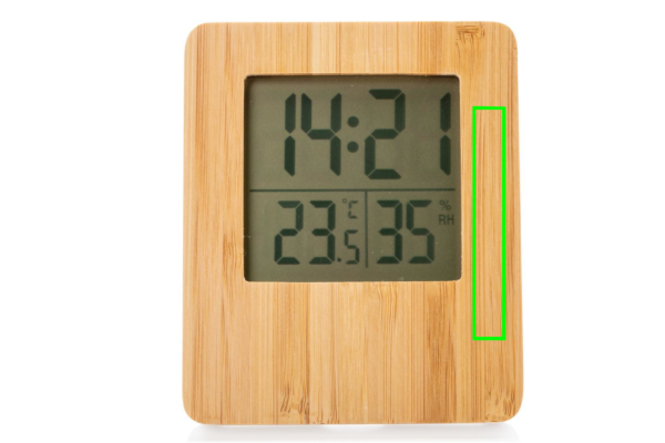 Bambu väderstation med 3 funktioner: tid/datum, luftfuktighet inomhus och temperatur. 2 AAA baterier medföljer. Tillverkad i bambu och ABS. Fuktighetstolerans max 5%.