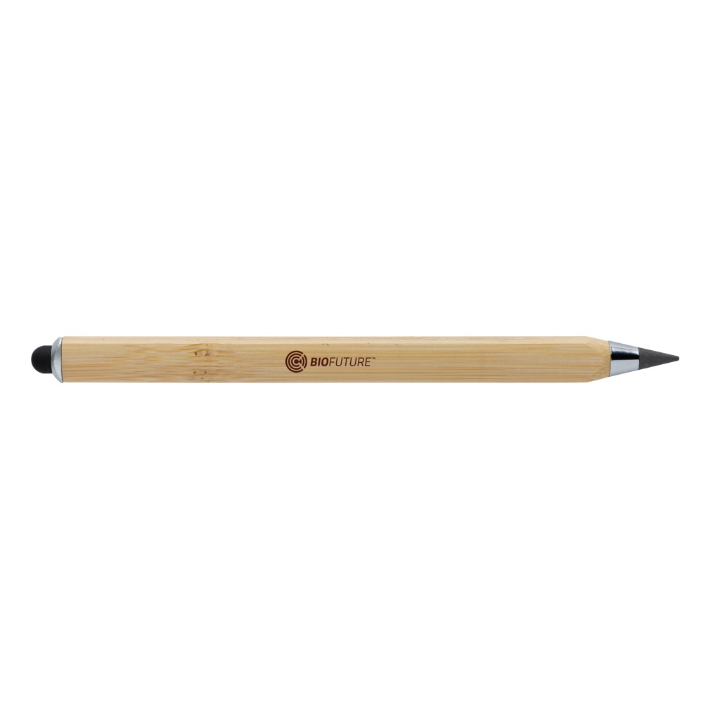 Modern infinity-penna tillverkad av FSC® 100% certifierad bambu. Triangelformad kropp med en sida med CM-angivelse och en sida med tumangivelse. Traditionella träblyertspennor skriver bara upp till cirka 200 meter, men denna träfria infinity-penna har en skrivlängd på upp till cirka 20.000 meter då den använder en grafitspets för att producera en grafitlinje. Den skriver inte bara som en penna, utan markeringarna kan också raderas. Den fungerar genom att lämna en grafitlinje på pappret precis som en vanlig traditionell träblyertspenna, men den slits så långsamt att den håller längre än 100 traditionella träblyertspennor! Med touchpoint för att manövrera den mobila enheten. Levereras i FSC®-mixförpackning.