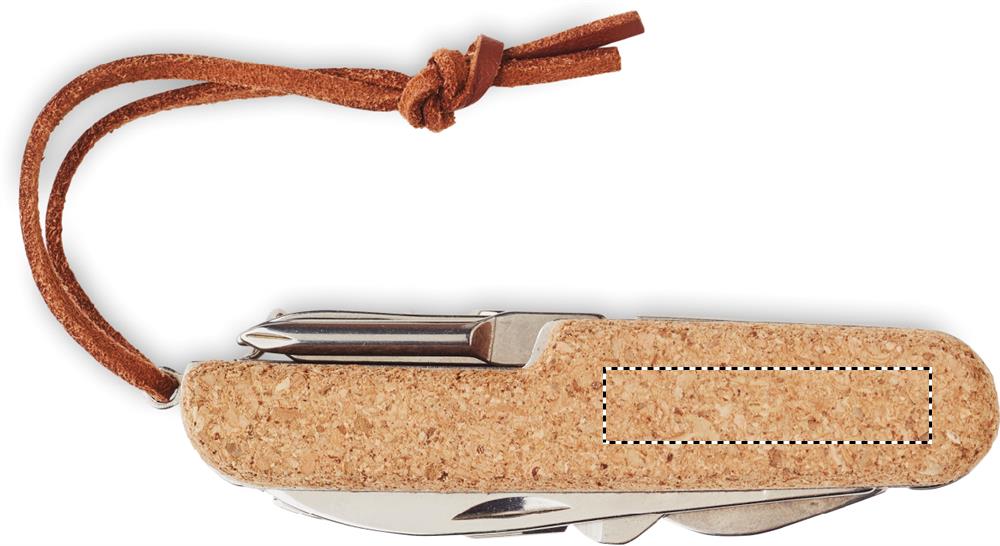 Fickkniv i rostfritt stål med flera funktioner, korköverdrag och PU-snöre. 7 funktioner, 2st öppnare, kniv, sax, skruvmejsel stjärna och flat, fil och korkskruv.