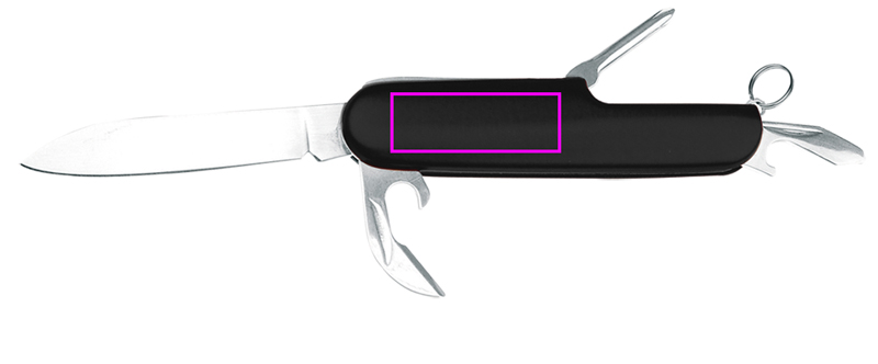 Praktisk fickkniv i rostfritt stål med sju delar, inklusive ett stort blad, burk- och flasköppnare, korkskruv, Phillips och slitsad skruvmejsel och en nyckelring. Vi graverar din logotyp på aluminiumskalet.