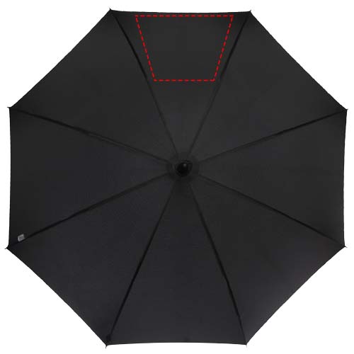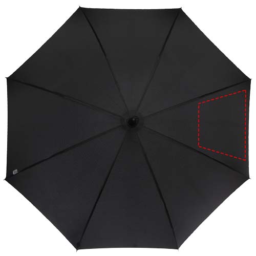 Automatiskt öppnande paraply med en pongee polyester-kupol, och ett robust svart pläterat metallskaft. Den högkvalitativa ramen i glasfiber ger maximal flexibilitet i blåsiga förhållanden. Kryckhandtag med kolutseende och svarta förnicklade spetsar. Märkesdetaljer från Luxe på den vävda etiketten på kupolen och stängningsremmen. Gott om plats för dekor på varje panel.