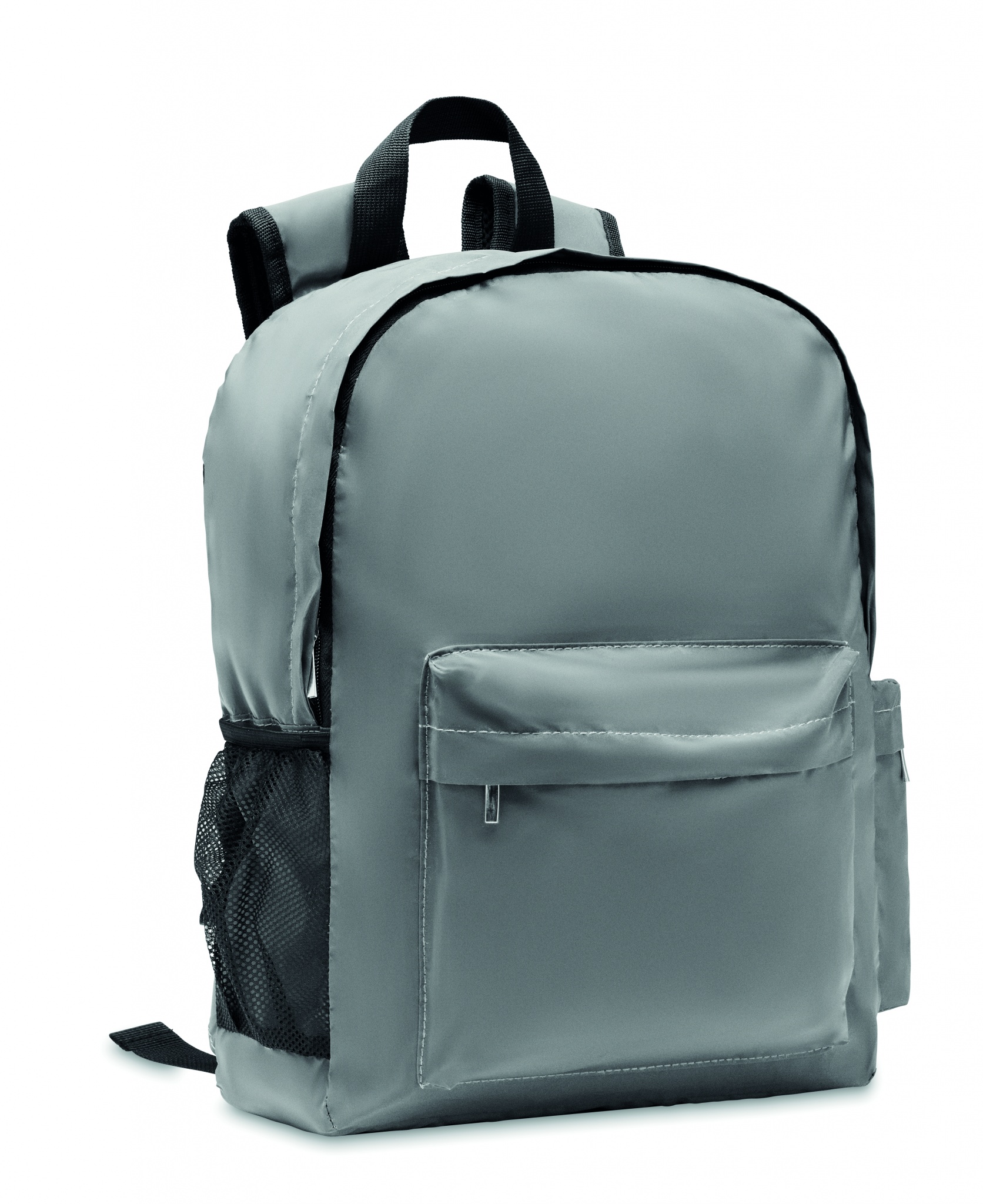 Ryggsäck i högreflekterande 190T polyester med snöre på framsidan. Vadderad rygg, remmar och botten. Den har ett fack för bärbar dator. max 15'' Ficka med dragkedja på framsidan och en nätficka på sidan och andra fickor med dragkedja på sidan.