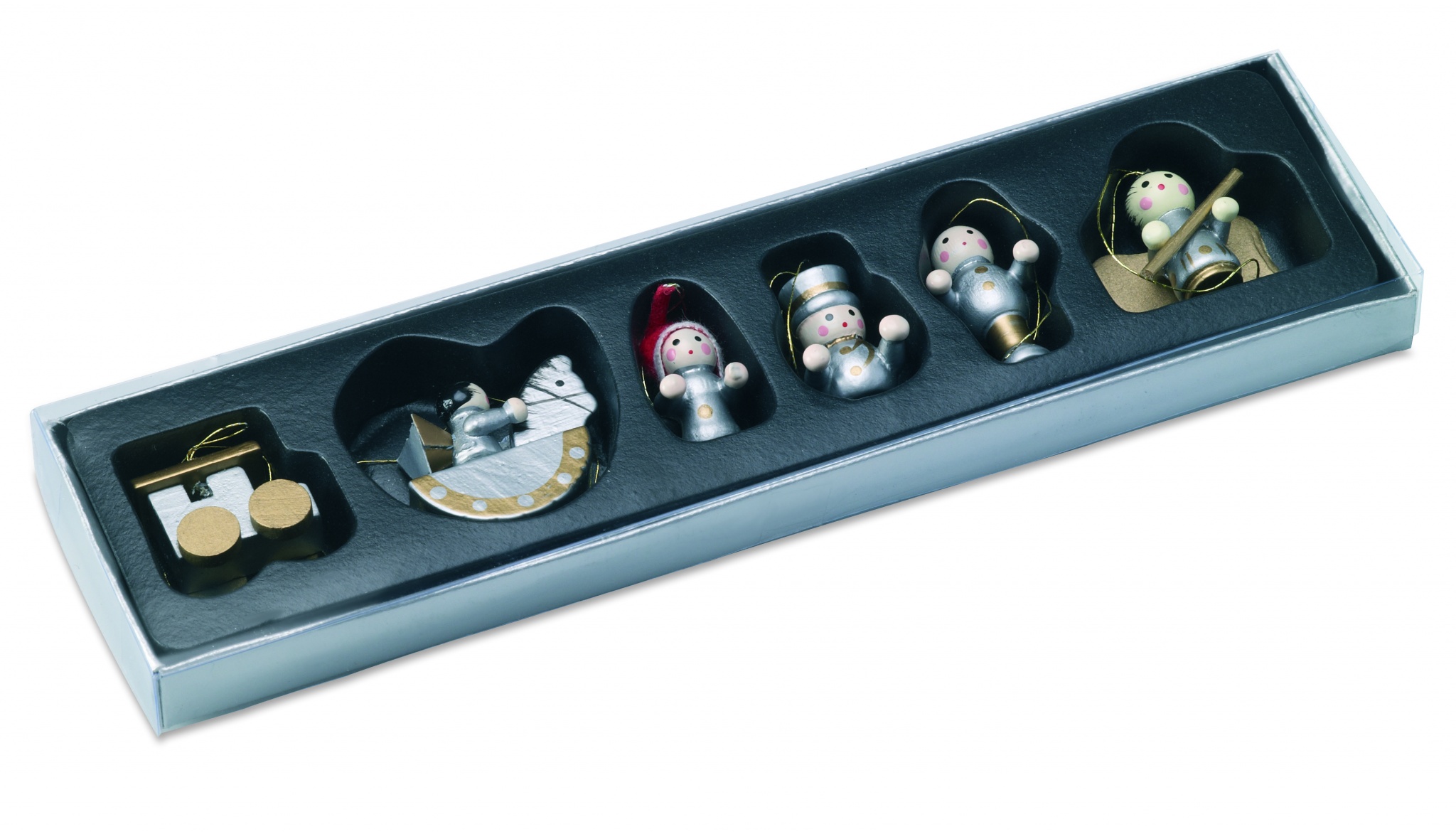 6 olika julgransdekorationer i trä som är förpackade i en presentkartong med transparent lock.