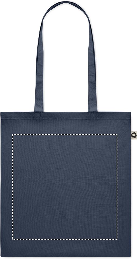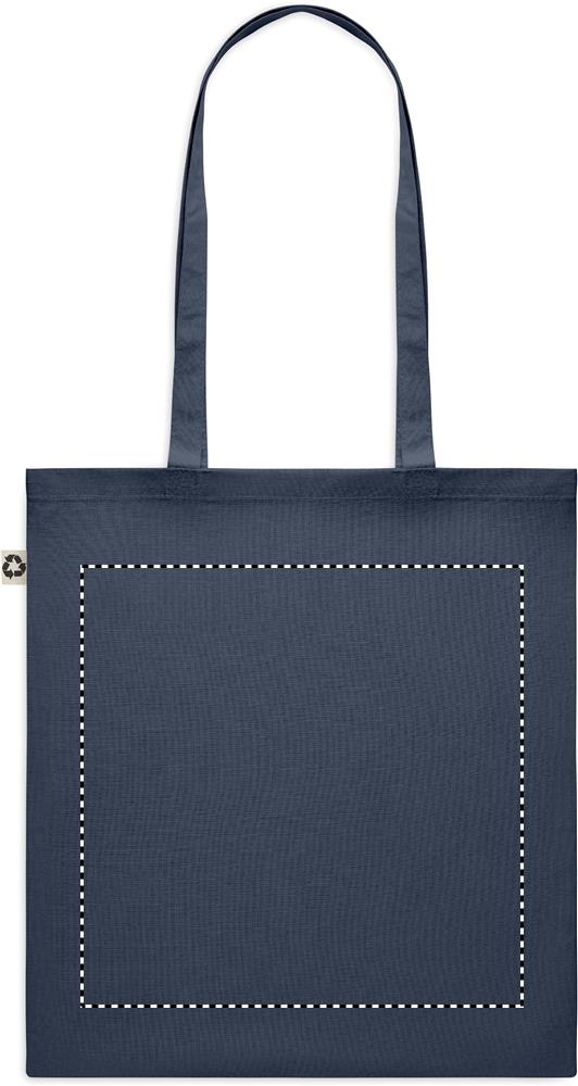 Kasse i återvunnen bomull (65 % återvunnen bomull, 35 % vanlig bomull) med långa handtag. 140 gr/m².