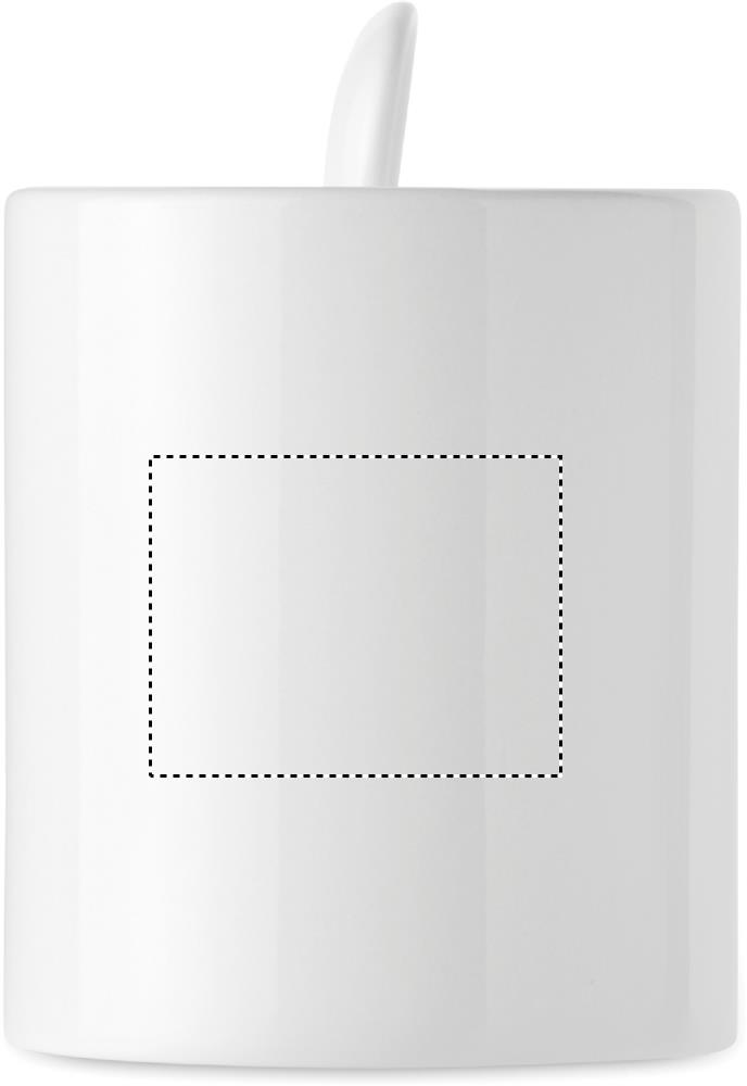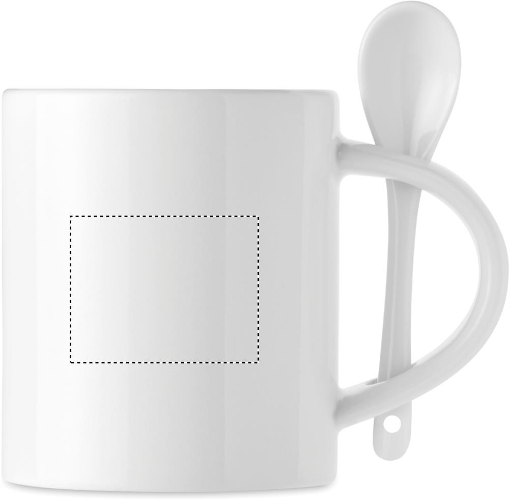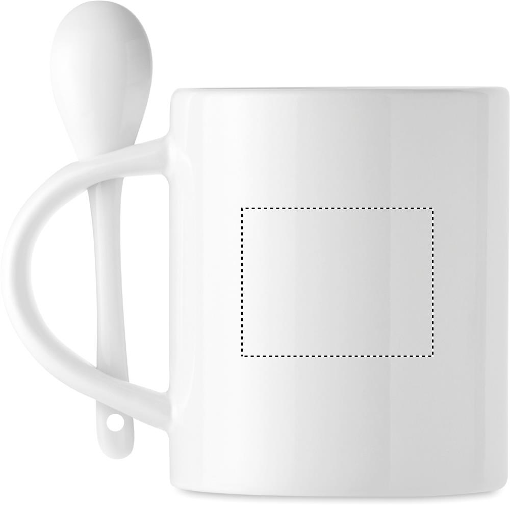 Keramikmugg med sked. Gjord med specialbeläggning för sublimationstryck. Skeden förvaras i handtaget. Kapacitet: 300 ml.