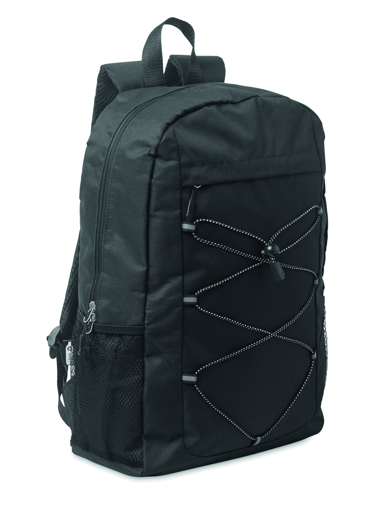 Ryggsäck i 600D RPET-polyester med dekorationssnöre och ficka med dragkedja framtill. Nätfickor på båda sidor.