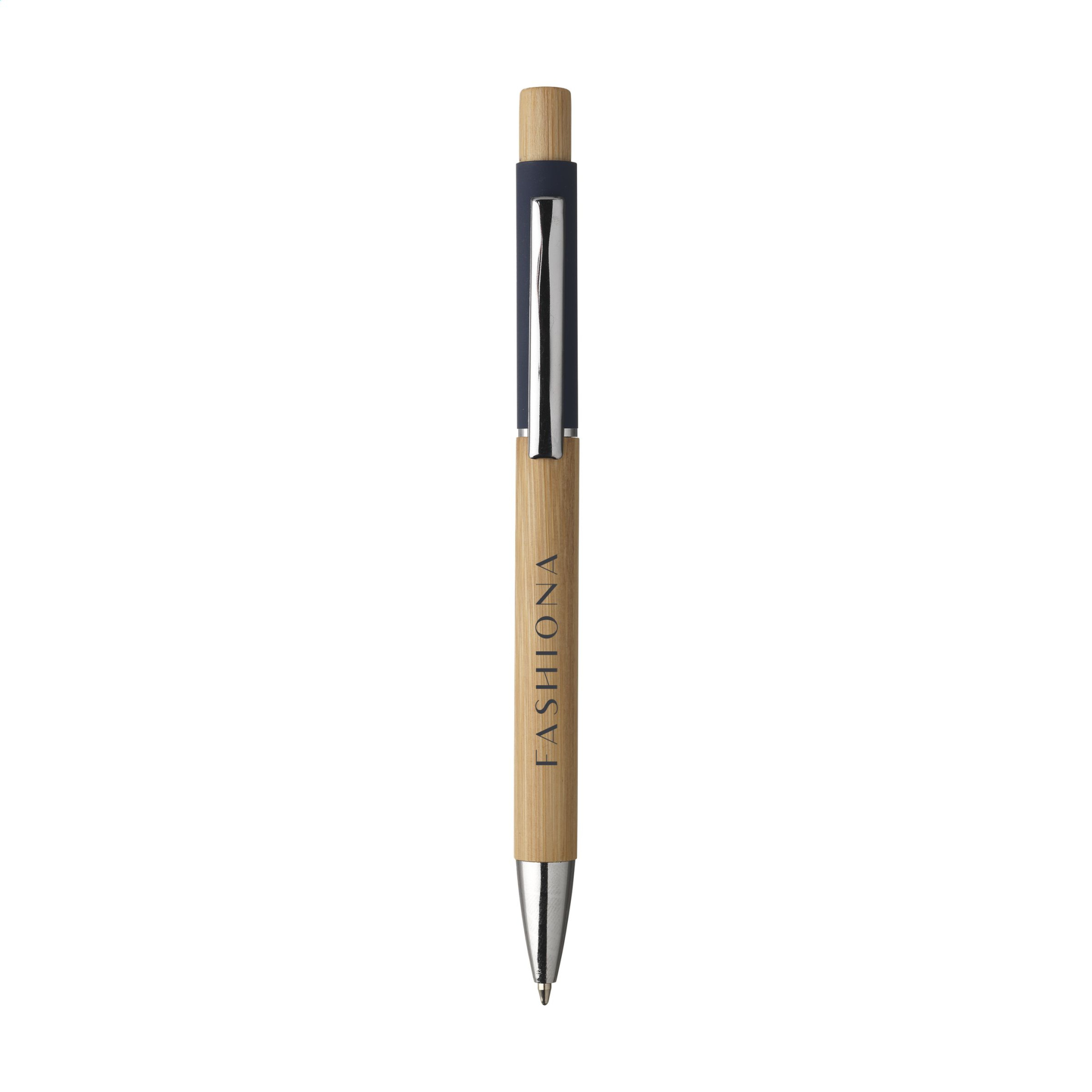WoW! Kulspetspenna med blått bläck med cylinder och tryckknapp gjord av FSC 100% certifierad bambu. Metallklämma. Toppen av pipan är täckt med en snygg gummerad beläggning.