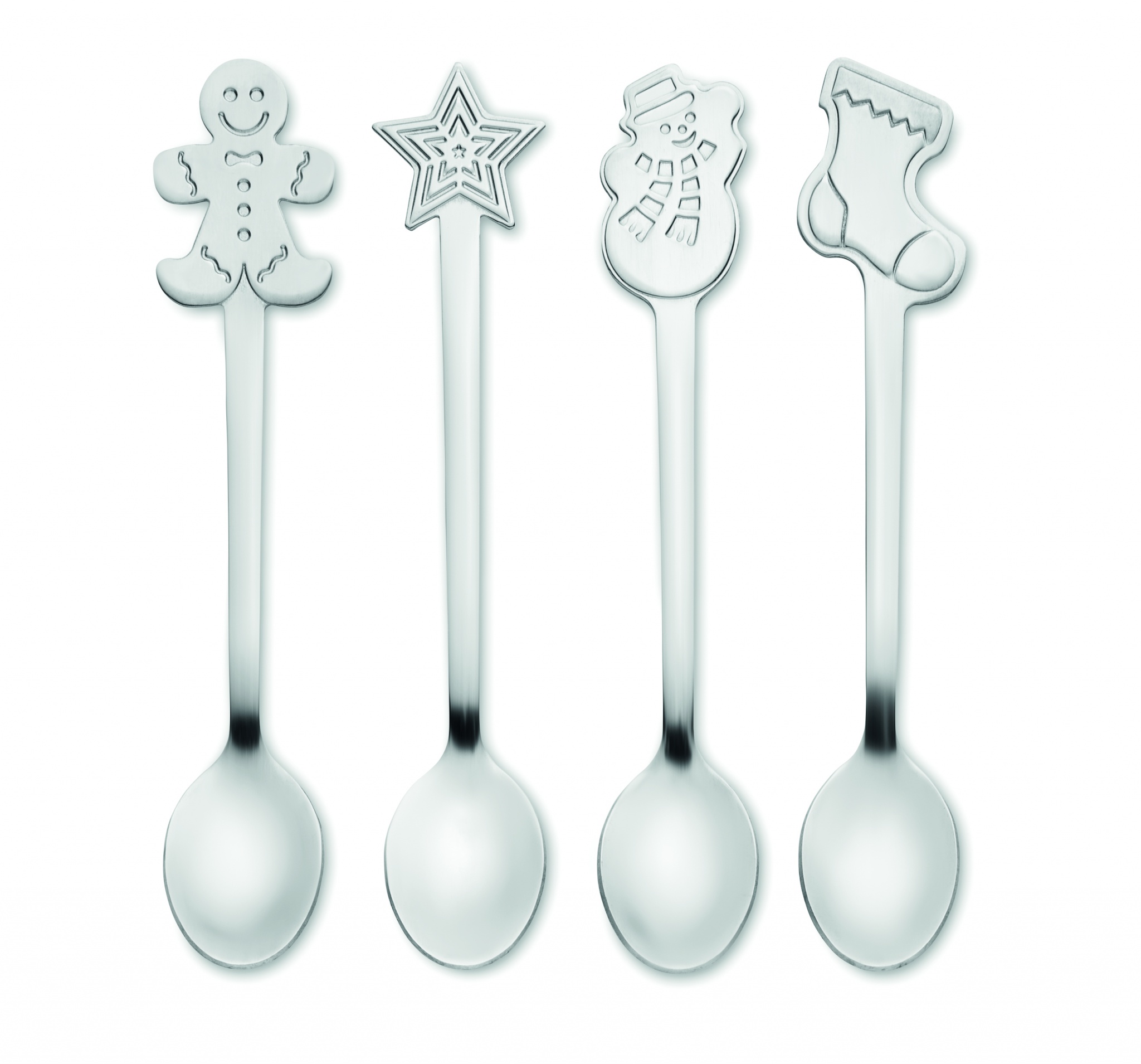 Uppsättning med 4 olika teskedar med julmotiv i rostfritt stål. Presenteras i presentförpackning.