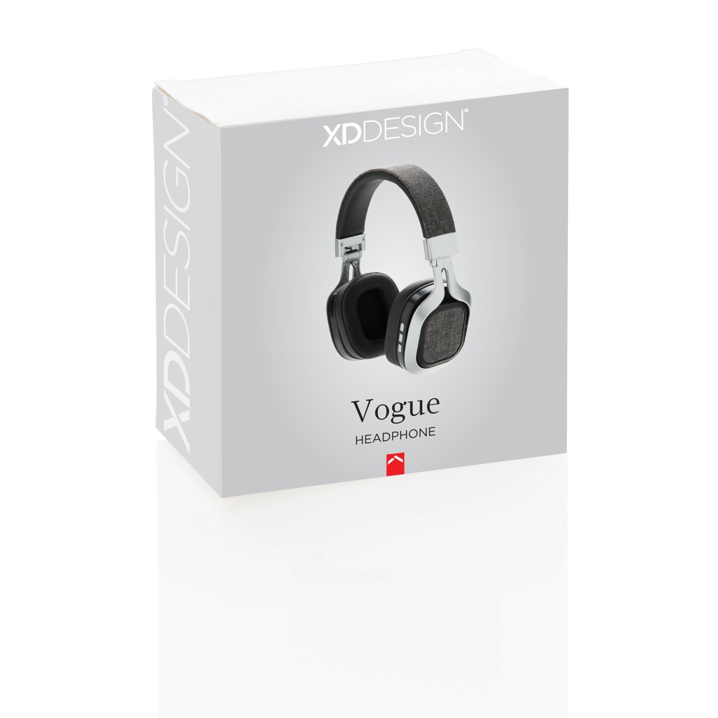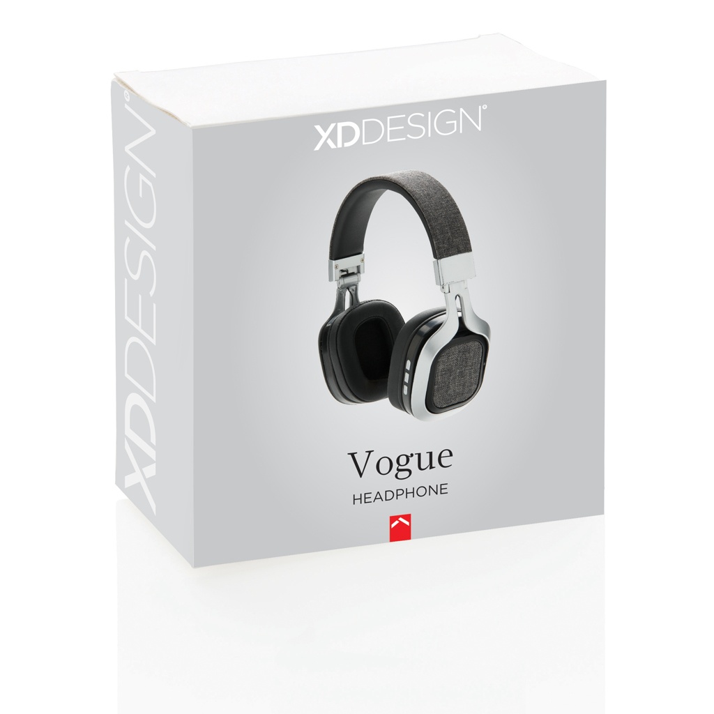 Vogue over-ear hörlurar med tygklädsel. Den bekväma passformen där hela örat omsluts ger en perfekt ljudupplevelse. Trendigt tyg på utsidan och bekväma PU öronkuddar och huvudbåge. Hörlurarna är hopvikbara och därmed lätta att ha med sig överallt. BT 4.0 för perfekt anslutning med en räckvidd på upp till 10 m. Inbyggt 200 mAh batteri ger upp till 6 tim speltid. Handsfree funktion för att besvara samtal. Inklusive Micro USB-kabel. Registrerad design®
